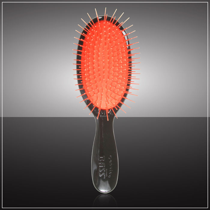 The outer section of bamboo pins separates and glide easily through the hair so the center core of natural bristles can reach the deeper layers capturing and distributing more natural oils for superior conditioning and shining. The unique free-standing handle conforms to the natural contours of a grasping hand and employs a 5-degree posterior tilt of the brush head which allows the wrist to remain in a more neutral position on common brush strokes for improved comfort and diminished strain.